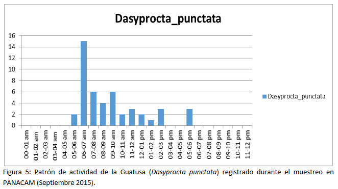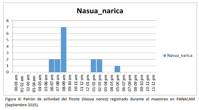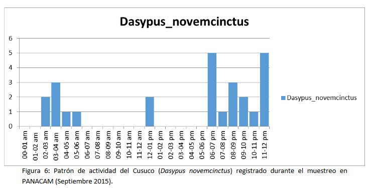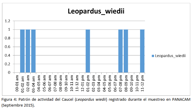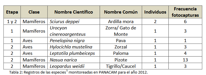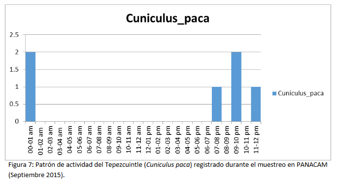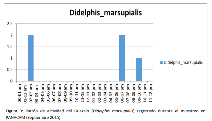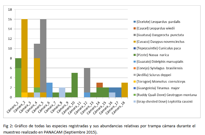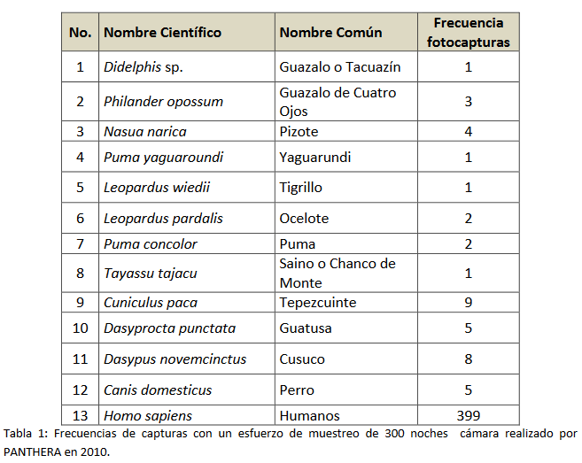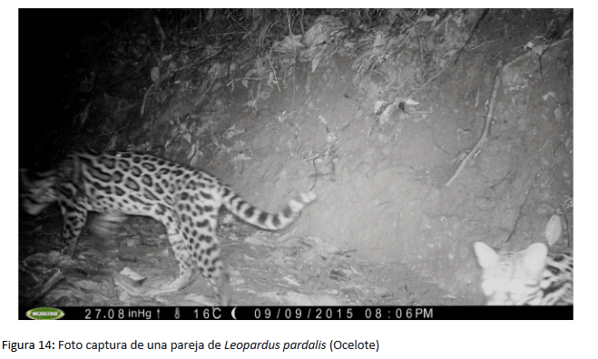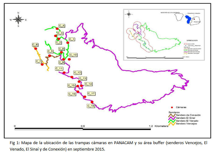 Los mamíferos forman parte fundamental de la biodiversidad en las áreas protegidas de Honduras y sus ecosistemas. Los grandes depredadores como los felinos, funcionan como controladores en la dinámica de las poblaciones de presas y son indicadores de la integridad de los ecosistemas, por su vulnerabilidad a los cambios bruscos en sus hábitats. Se colocaron 18 trampas cámara en cuatro de los senderos turísticos del Parque Nacional Azul Meámbar. Las trampas estuvieron instaladas del 8 al 28 de Septiembre de 2015. Se obtuvo un registro total de 122 fotografías que pertenecen a 9 especies de mamíferos, distribuidas en 8 familias, con las cuales se estimaron las abundancias relativas capturadas con las cámaras. Se tuvo un esfuerzo de muestreo de 360 noches cámara y un promedio de 6.1 fotografías efectivas/día. Se corrió el análisis de rarefacción para establecer la curva de acumulación de especies y medir el esfuerzo de muestreo la cual no alcanzo su asíntota indicando que es necesario aumentar el tiempo de muestreo para futuros monitoreos. Se establecieron los rangos de actividad de las especies capturadas que en su mayoría presentan actividad nocturna. Durante el monitoreo hubo una alta visitación turística. Se registran como especies relevantes el Leopardus pardalis (Ocelote), Leopardus wiedii (Tigrillo) y especies menores como Dasyprocta punctata (guatuza), Cuniculus paca (Tepezcuintle), entre otras especies que son potenciales presas de estos dos importantes felinos. El registro fotográfico nos muestra importantes especies que contribuyen al funcionamiento ecológico del parque.